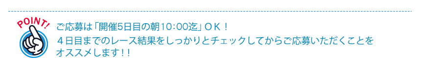 ※予期せぬ事態によりレース開催自体が中止となった場合は、開催途中であっても当キャンペーンは全ての中止とし、それまでのご応募いただいたお客様情報は全て破棄させていただきます。