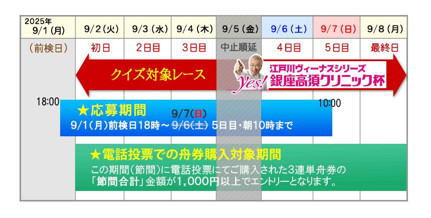 2025年9月1日(月)前検日・18時 〜 9月6日(土)9月7日(日) 5日目・朝10時まで