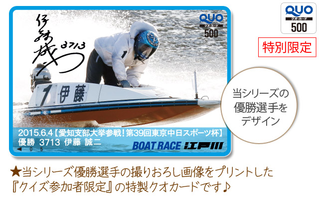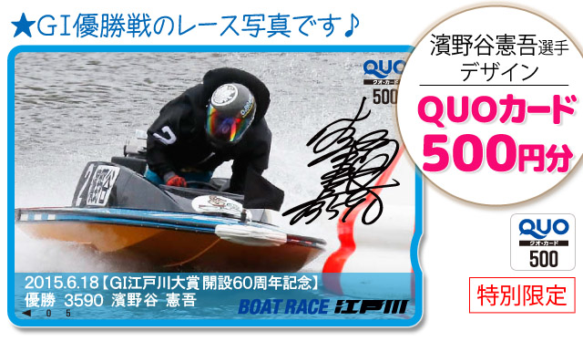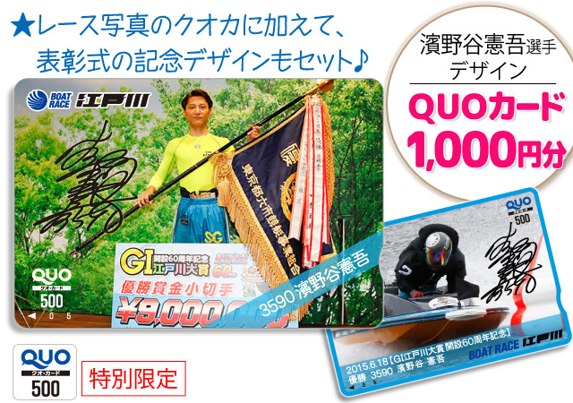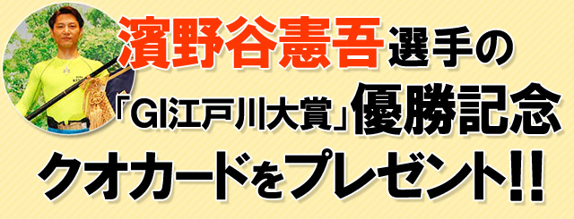 さらに!期間中に所定の金額以上の舟券をご購入いただいた方には、先日行われた「G1江戸川大賞」で優勝した濱野谷憲吾選手の特製クオカードのプレゼントもありますので、皆様ふるってご参加ください。