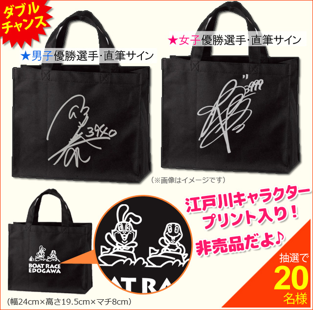 クイズの正解・不正解を問わず、当クイズにご参加いただいた方の中から、抽選で20名様に優勝選手の直筆サイン入り「江戸川オリジナル・トートバック」をプレゼント!