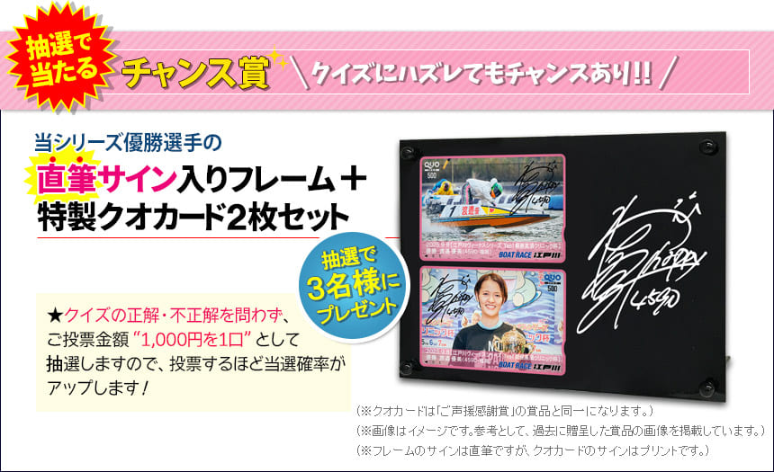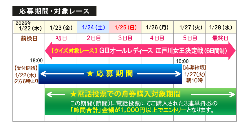 ※レースが6日間の開催日数を消化できずに中止または打ち切りとなった場合、中止または打ち切り前の「最終確定実施レース」までの舟券購入・クイズの回答を集計して正解者及び賞品贈呈の対象者の抽出を行います。